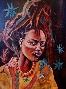 This vivid red portrait, created with acrylics and pencils, emphasizes the mask-like qualities of the artist's work and her emotional detachment from reality. It represents the neo-expressionism movement pioneered by Sam van der Wouden.
